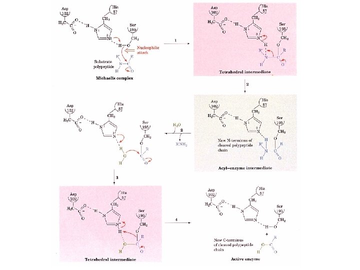 Catalytic mechanism 1. After the substrate binds Ser 195 nucleophilically attacks the scissile peptide bond to form a transition state complex called the tetrahedral intermediate (covalent catalysis) the imidazole His 52 takes up the proton Asp 102 is hydrogen bonded to His 57. Without Asp 102 the rate of catalysis is only 0. 05% of wild-type. 2. Tetrahedral intermediate decomposes to the acylenzyme intermediate. His 57 acts as an acid donating a proton. 3. The enzyme is deacylated by the reverse of step 1 with water the attacking nucleophile and Ser 195 as the leaving group.
