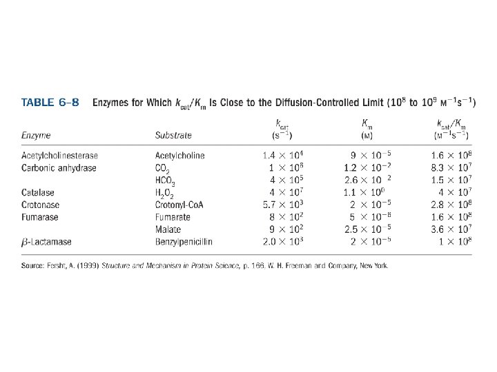 Catalytic efficiency • An estimate of "how perfect" the enzyme is • kcat/Km is an apparent second-order rate constant • It measures how the enzyme performs when S is low • The upper limit for kcat/Km is the diffusion limit - the rate at which E and S diffuse together