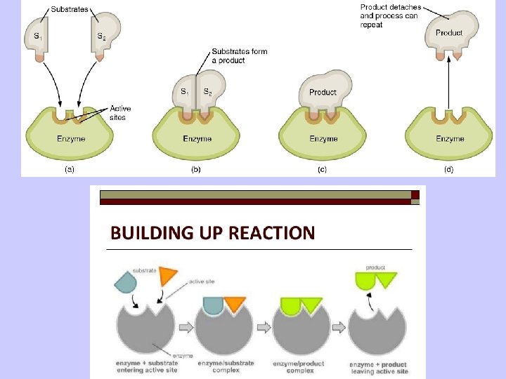 How do they work? l The reactants are known as substrates (what is being broken or built) l Enzymes provide a site(space) where substrates can be brought together to react. (like a docking station) l This binding region on the enzyme is called the active site.