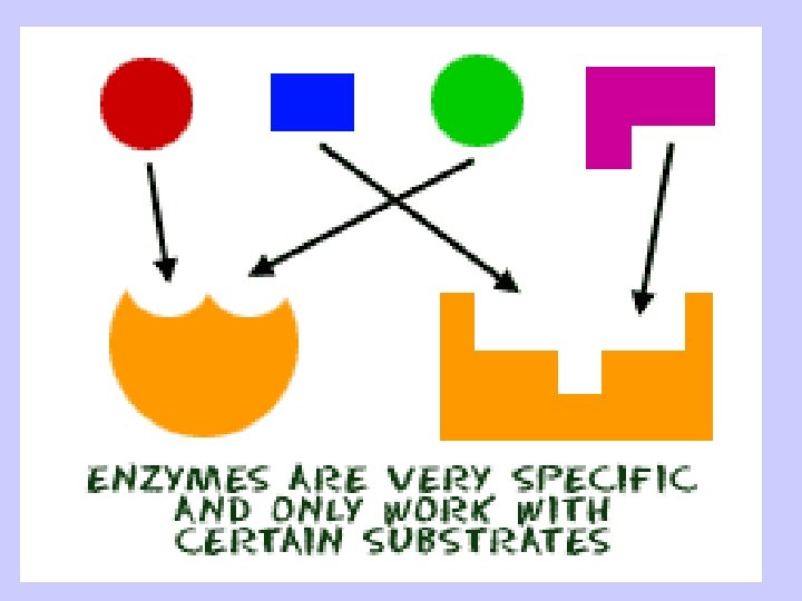 Enzyme Specificity l Enzymes are picky! l Each enzyme catalyzes only one reaction. l For example, there is a specific enzyme that breaks maltose down into 2 glucose molecules. l B/C this is the only reaction this enzyme carries out- called maltase l Many enzymes are named this way replacing suffix with –ase.