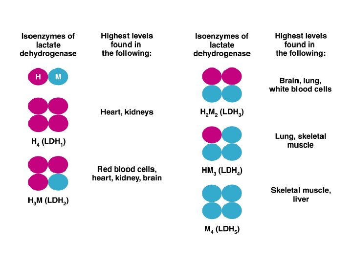 Isoenzymes n n Isoenzymes group of enzymes differs in amino acid sequence ( structure) but catalyze the same reaction in different tissues in the body. Lactate dehydrogenase, which converts lactate to pyruvate, (LDH) consists of five isoenzymes.