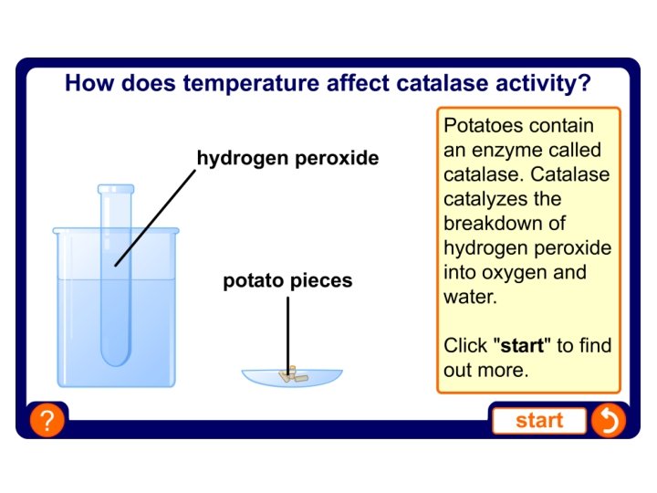 Your Turn! The Effect of Catalase Question/Problem: What are the effects of p. H on enzymatic reactions? Observations/Control: Watch the following clip up to 0: 35. http: //www. youtube. com/watch? v=bq. Esv. Nhv. N 8 E What initial observations can you make about the effect of this enzyme? Catalase is an enzyme that breaks down hydrogen peroxide. (H 2 O 2 → H 2 O + O 2) The presence of bubbling (gas) makes you know it is working. Hypothesis: What effect do you think that p. H will have on the action of catalase in potatoes at p. H of 4, 7 and 9? At what p. H will it work the best, and which p. H will it work the worst? Explain why in your response. Experiment: Watch the remainder of the clip. Take note of the anemometer reading in red. We’ll watch the clip again to make sure…freeze at 1: 30.