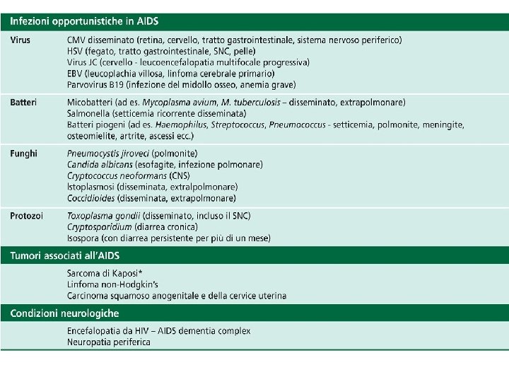 HIV: virus dell’immunodeficienza acquisita AIDS • Immunodeficienza conclamata (in assenza di terapia): presenza di infezioni opportunistiche o di neoplasie dovute ad agenti microbici • Il rischio di infezioni opportunistiche aumenta proporzionalmente al declino dei linfociti CD 4+ • tempo di sopravvivenza alla diagnosi di AIDS influenzato da diversi fattori: • - patologia d’esordio dell’AIDS • - età del paziente alla diagnosi • - terapia antiretrovirale