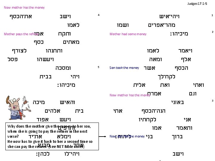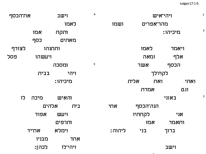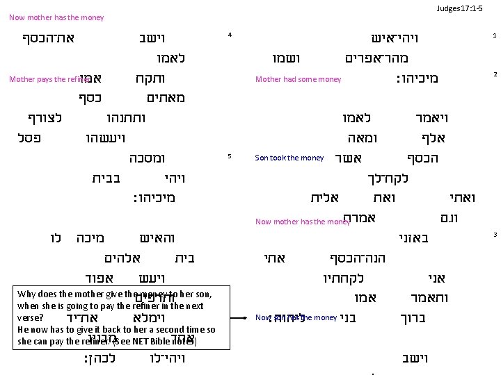 Judges 17: 1 -5 Now mother has the money את־הכסף וישב לאמו Mother pays the refiner אמו ותקח כסף מאתים לצורף ותתנהו פסל ויעשהו ומסכה בבית ויהי מיכיהו׃ 4 5 מיכה לו והאיש NET Bible: In the Hebrew אלהים text the statement, "בית but now I am giving it back to you, " appears at the end of v. 3 and אפוד But v. 4 ויעש is spoken by the mother. indicates that she did not give the money back to her son. Unless the ותרפים statement is spoken by the woman to the LORD, it appears to be misplaced and fits much better in v. 2. It את־יד וימלא may have been accidentally omitted from a manuscript, written in the margin, and then later inserted מבניו אחד in the wrong place in another manuscript. לכהן׃ ויהי־לו ויהי־איש ושמו מהר־אפרים Mother had some money מיכיהו׃ לאמו ויאמר ומאה אלף Son took the money אשר הכסף לקח־לך אלית ואתי אמרת וגם Now mother has the money באזני אתי הנה־הכסף לקחתיו אני אמו ותאמר Now ליהוה׃ son has the money בני ברוך וישב 1 2 3