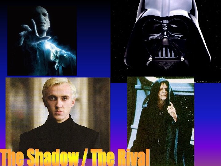 Challenges and Tasks Continued v Friends are provided to aid the hero in his quest (“The Allies”) v The hero has to battle “The Shadow”. The Shadow is often a character who has many similarities to the hero, but has taken their journey in a different direction. v The hero has a guide ( also called “The Sage”) who will teach him about his inner strength. The Sage will not be with the hero along the entire journey.