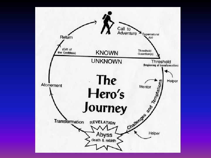 The Hero’s Journey 5. ) The Abyss v Represents the hero’s greatest challenge. v It is impossible to return from “The Abyss” unchanged and the hero has to fight in “The Abyss” alone. The Allies can’t help him past a certain point. v There is usually a confrontation with “The Shadow” in the Abyss and the physical location is often depicted as very dark and scary. v “The Shadow” has to be defeated before the hero can complete his journey