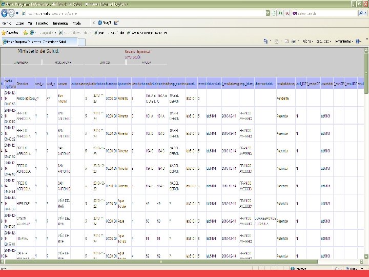 Vigilancia Epidemiológica • Difusión diaria de la información actualizada de la situación internacional en web. • Adecuación de normativa (Circular de vigilancia B 51/41 del 03 diciembre de 2010). • Refuerzo de la vigilancia de laboratorio clínico en conjunto con ISP (Circular Nº 12/2010 del 18 de noviembre). • Sistema de registro de consultas de diarrea en atención de urgencia. • Refuerzo del control en puntos de entrada ORD. Nº 4043 15 de diciembre.