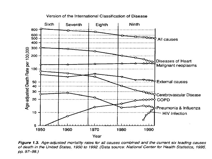 Razones posibles para cambios en las tendencias (cont. ) § Reales § Cambios en la distribución de edad de la población § Cambios en la sobrevida § Cambios en la incidencia de enfermedades resultante de § Factores genéticos § Factores ambientales Epidemiology (Schneider)