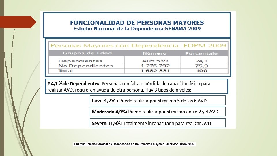 Estado de salud funcional de la población mayor de 65 años, según subgrupos de edad (Chile, 2012) Fuente: DEIS-MINSAL