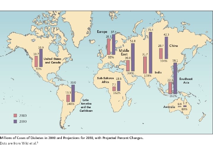 Epidemiologi � Secara global, pada 2010, diperkirakan 285 juta orang menderita diabetes, dengan tipe 2 sekitar 90% dari kasus � insiden DM meningkat dengan cepat, dan pada tahun 2030, jumlah ini diperkirakan hampir dua kali lipat. � Diabetes mellitus terjadi di seluruh dunia, namun lebih umum (terutama tipe 2) di negara-negara yang lebih maju. Peningkatan terbesar dalam prevalensi, diperkirakan terjadi di Asia dan Afrika, di mana kebanyakan pasien mungkin akan ditemukan pada tahun 2030 � Peningkatan kejadian di negara berkembang mengikuti tren urbanisasi dan perubahan gaya hidup. Beberapa juga meyakini adanya faktor lingkungan, tapi masih sedikit pemahaman tentang mekanismenya.
