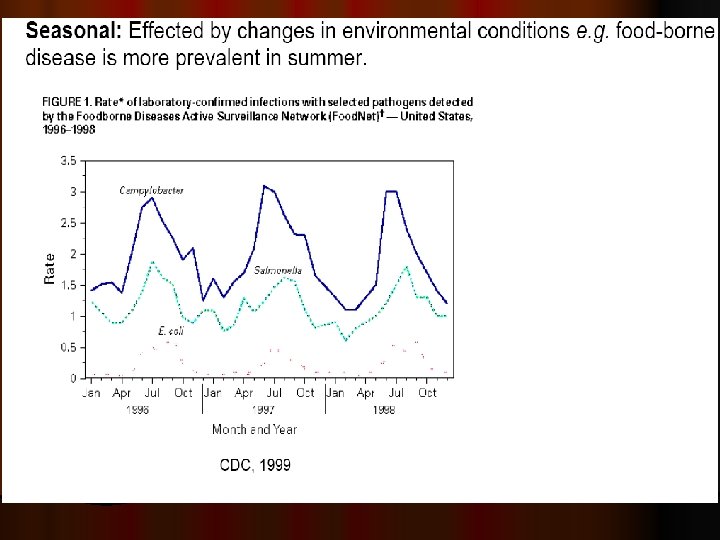 Musiman: Pola musiman bisa menyarankan hipotesis tentang: - bagaimana infeksi ditularkan - faktor 2 perilaku apa yang meningkatkan risiko - kemungkinan lain yang berkontribusi terhadap kejadian penyakit.
