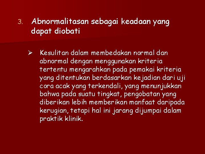 3. Abnormalitasan sebagai keadaan yang dapat diobati Ø Kesulitan dalam membedakan normal dan abnormal dengan menggunakan kriteria tertentu mengarahkan pada pemakai kriteria yang ditentukan berdasarkan kejadian dari uji cora acak yang terkendali, yang menunjukkan bahwa pada suatu tingkat, pengobatan yang diberikan lebih memberikan manfaat daripada kerugian, tetapi hal ini jarang dijumpai dalam praktik klinik.