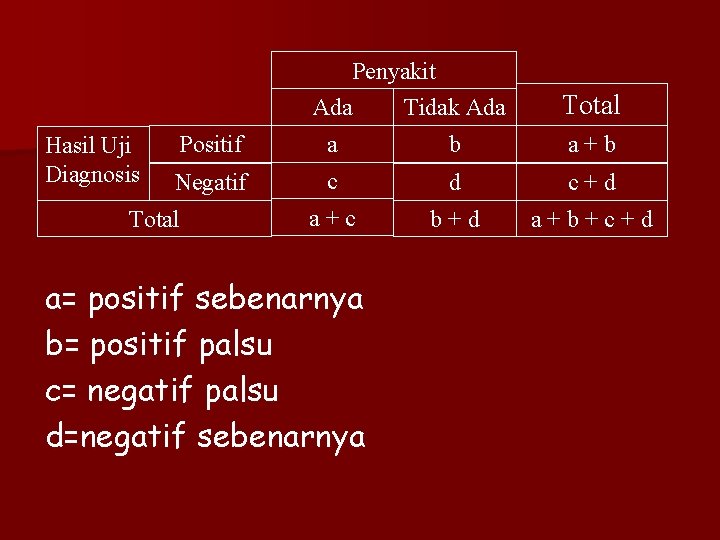 Penyakit Hasil Uji Diagnosis Ada Tidak Ada Total Positif a b a+b Negatif c d c+d a+c b+d a+b+c+d Total a= positif sebenarnya b= positif palsu c= negatif palsu d=negatif sebenarnya