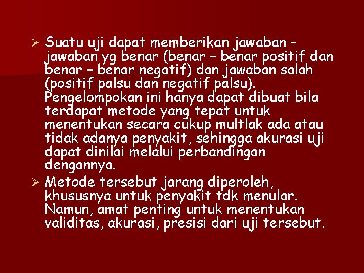 Suatu uji dapat memberikan jawaban – jawaban yg benar (benar – benar positif dan benar – benar negatif) dan jawaban salah (positif palsu dan negatif palsu). Pengelompokan ini hanya dapat dibuat bila terdapat metode yang tepat untuk menentukan secara cukup multlak ada atau tidak adanya penyakit, sehingga akurasi uji dapat dinilai melalui perbandingan dengannya. Ø Metode tersebut jarang diperoleh, khususnya untuk penyakit tdk menular. Namun, amat penting untuk menentukan validitas, akurasi, presisi dari uji tersebut. Ø