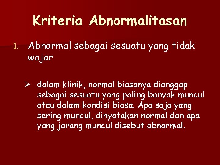 Kriteria Abnormalitasan 1. Abnormal sebagai sesuatu yang tidak wajar Ø dalam klinik, normal biasanya dianggap sebagai sesuatu yang paling banyak muncul atau dalam kondisi biasa. Apa saja yang sering muncul, dinyatakan normal dan apa yang jarang muncul disebut abnormal.