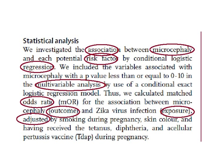 Intervalo de confiança (95%) Qual é a faixa de valores que o resultado (RR) pode assumir em uma probabilidade de 95%? Tabagismo: OR = 3, 2 (1, 5 – 7, 0) ZKV e Microcefalia: OR = 87, 0 (15, 6 - ∞)