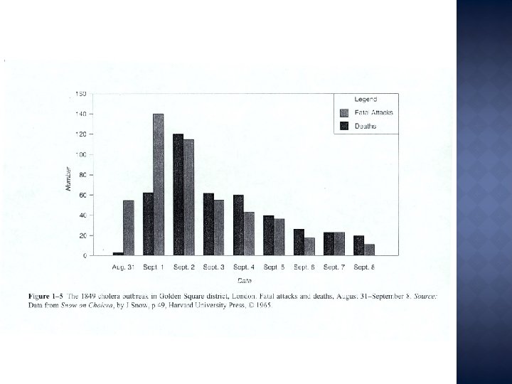 HISTORY… 4) William Farr (1839): Established application of vital statistics for the evaluation of health problems 5) John Snow (1854): tested a hypothesis on the origin of epidemic of cholera 6) Alexander Louis (1872): Systematized application of numerical thinking (quantitative reasoning) 18