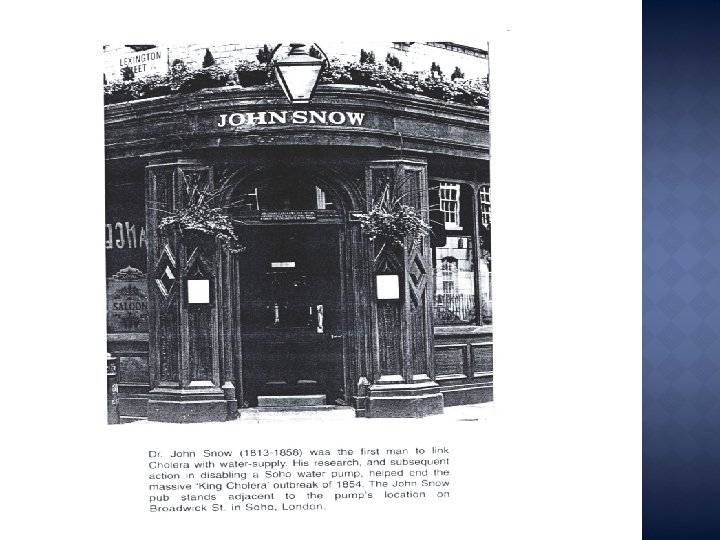 HISTORY OF EPIDEMIOLOGY However Snow did not agree he believed that cholera is transmitted through contaminated water. He began his investigation by determining where in this area person with cholera lived and worked. He then used this information to map for distribution of diseases. Snow believed that water was the source of infection for cholera. He marked the location and searched the relationship between cases and water sources. He found that cholera was transmitted though contaminated water. This was a major achievement in epidemiology. 21