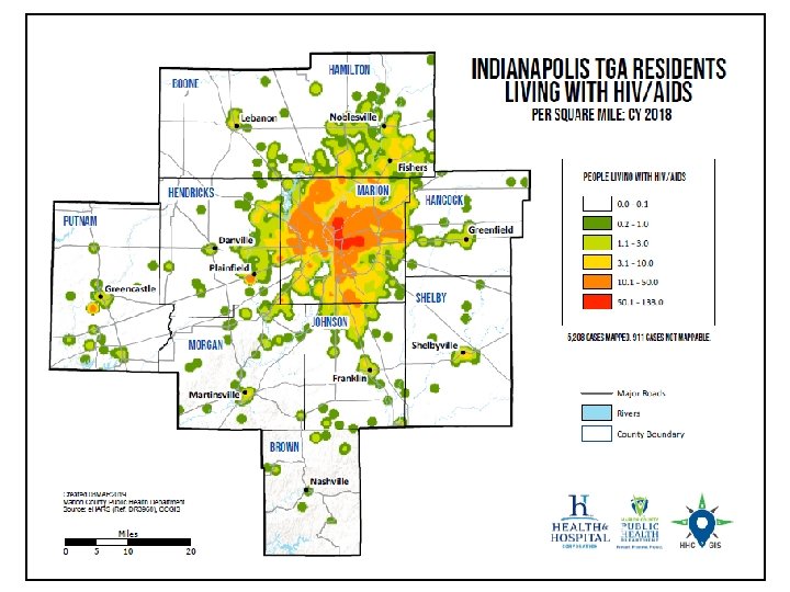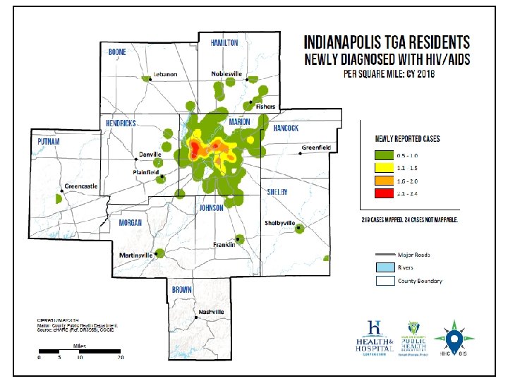 HIV/AIDS Prevalence by County No. Marion 5, 258 Hamilton 261 Johnson 193 Hendricks 175 Putnam 66 Hancock 57 Morgan 54 Boone 45 Shelby 31 Brown 9 *95% confidence interval % of HIV in TGA Rate [95% CI*] 85. 5% 550. 5 [535. 8 -565. 5] 4. 2% 78. 8 [69. 5 -89] 3. 1% 123. 5 [106. 7 -142. 2] 2. 8% 104. 9[89. 9 -121. 6] 1. 1% 174. 8 [135. 2 -222. 3] 0. 9% 70. 9 [53. 2 -92. 5] 0. 9% 81. 6 [61. 8 -105. 8] 0. 7% 66. 8 [48. 7 -89. 4] 0. 5% 69. 6 [47. 3 -98. 8] 0. 1% 59. 8 [27. 4 -113. 5] RR [95% CI*]: to Shelby 7. 9 [5. 6 -11. 2] 1. 1 [0. 78 -1. 6] NS 1. 5 [1. 0 -2. 2] 2. 5 [1. 6 -3. 8] NS NS NS 1. 0 NS No significant changes between 2017 and 2018