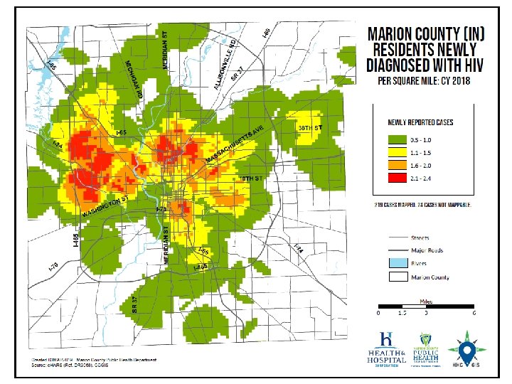 HIV Incidence by County Marion % of HIV No. in TGA Rate [95% CI*] RR [95% CI*]: to Others 205 84. 4% 21. 5 [18. 6 -24. 6] 6. 1 [4. 1 -9. 1] Hendricks 17 7. 0% 12. 7 [11. 1 -14. 4] 2. 9 [1. 6 -5. 3] Others* 28 11. 5% 3. 5 [2. 3 -5. 1] 1. 0 * 95% confidence interval Marion County HIV incidence was at least 4 times that of TGA counties outside of Marion and Hendricks