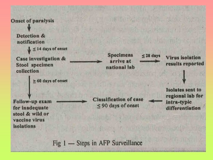 COMPONENTS OF AFP SURVEILANCE 1. The AFP surveillance network and case notification 2. Case and laboratory investigation 3. Outbreak response and active case search in the community 4. 60 -day follow-up, cross-notification and tracking of cases 5. Data management and case classification 6. Virologic case classification scheme 7. Surveillance performance indicators