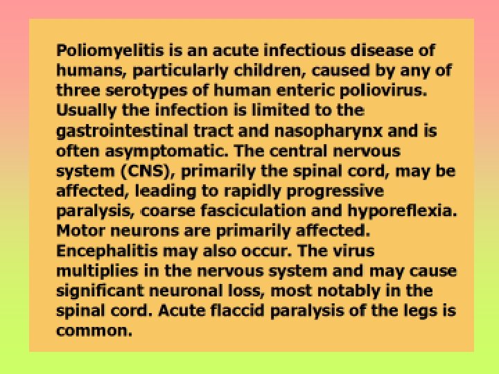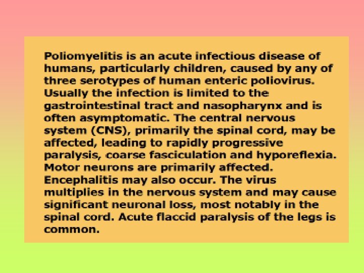 • Inapperent(sub-clinical) Infection: this occurs approximately in 95 per cent of poliovirus infection. There are no presenting symptoms. Recognition only by isolation. • Abortive Polio Or Minor Illness: occurs approximately in 4 -8 per cent of the infection. It causes only a mild or self limiting illness due to viraemia. The patient recovers quickly. • Non paralytic polio: occurs approximately in one per cent of all infections. The presenting features are stiffness and pain in neck and back. The disease lasts for two to ten days. Recovery is rapid. • Paralytic polio: occurs in less then one per cent of infections. The virus enters the brain and causes varying degree of disability.