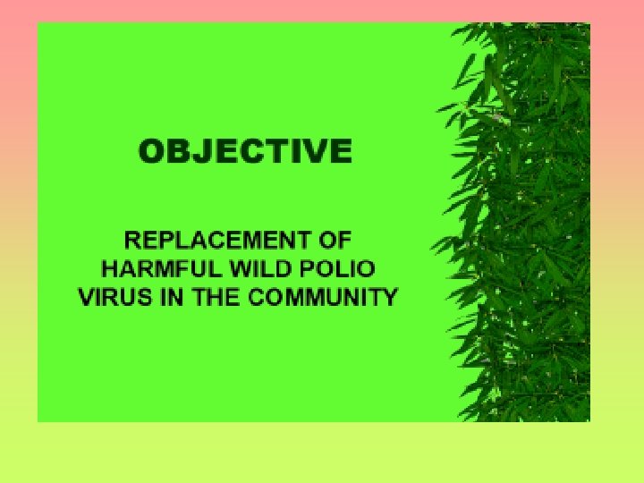 OBJECTIVES: • TO INTERRUPT TRANSMISSION OF THE WILD POLIOVIRUS AS SOON AS POSSIBLE AND CERTIFY ALL WHO REGIONS POLIO-FREE BY THE END OF 2005; • TO IMPLEMENT THE POLIO ENDGAME PROGRAMME OF WORK, INCLUDING CONTAINMENT OF WILD POLIOVIRUS, GLOBAL POLIO-FREE CERTIFICATION, AND THE DEVELOPMENT OF A POST-ERADICATION IMMUNIZATION POLICY; • TO CONTRIBUTE TO HEALTH SYSTEMS DEVELOPMENT BY STRENGTHENING ROUTINE IMMUNIZATION AND SURVEILLANCE FOR COMMUNICABLE DISEASES.