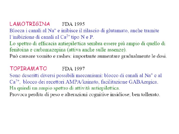 Storia • • • Phenobarbitone 1912 Phenytoin 1938 Primidone 1952 Ethosuximide 1955 Carbamazepine 1965 Sod. Valproate 1973 Valproic acid 1993 Clonazepam 1974 Clobazam 1979 • • Vigabatrin Lamotrigine Gabapentin Tiagabine Topiramate Levetiracetam Fosphenytoin Zonisamide 1989 1991 1993 1995 2000 2001 2005