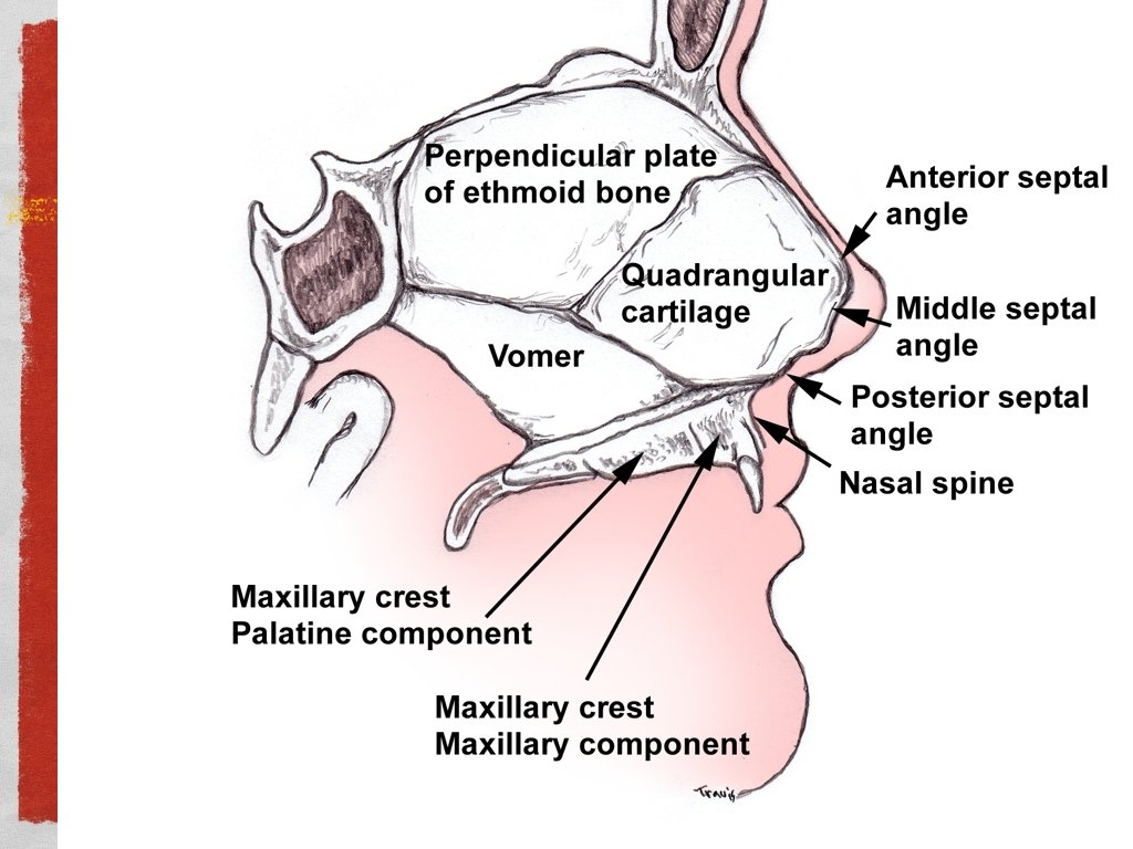 Septum nasi Koosneb kõhrelistets ja luulistets osistest, ääristatud limaskestaga Limaskesta kaudu toimub kõhre ja luu verevarustus Perikondriumi vigastuse tõttu (nt septaalne hematoom) häirub kõhre verevarustus ja võib kujuneda sadulnina