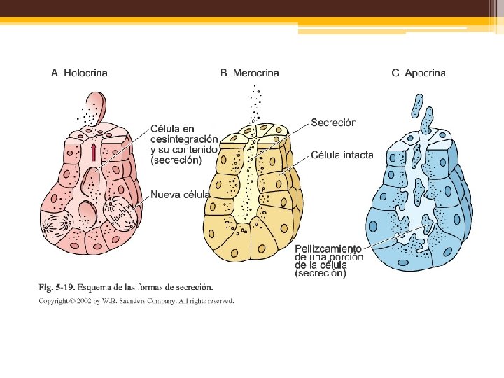 • El producto secretorio puede ser una hormona polipeptídica de la glándula hipófisis. • Sustancia cérea de las glándulas ceruminosas del conducto auditivo. • Mucinógeno de las células caliciformes. • Leche glandulas mamarias. • Otras glándulas sudoríparas, glándulas salivales mayores.