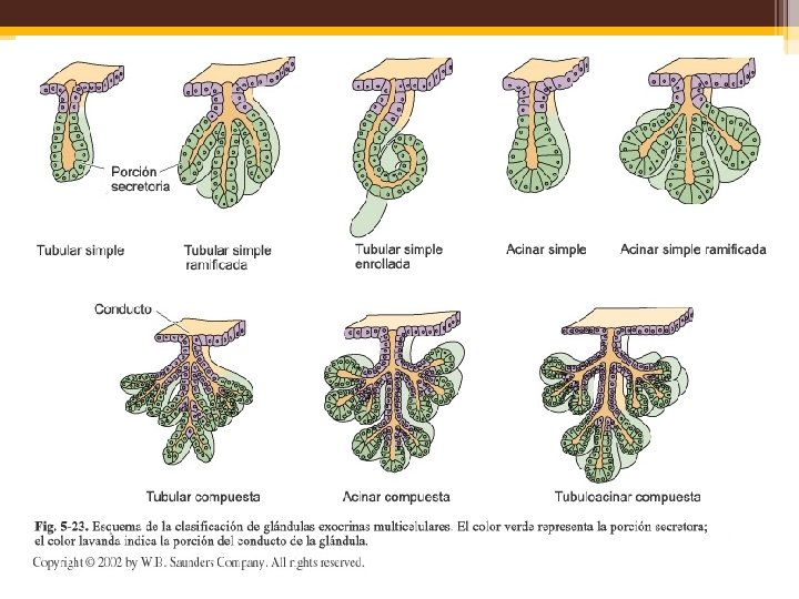 Tejido epitelial. • El tejido epitelial se encuentra en dos formas: ▫ Como hojas de células contiguas (epitelios) que cubren el cuerpo en su superficie externa y lo revisten en su superficie interna. ▫ Como glándulas, originadas en células epiteliales invaginadas.
