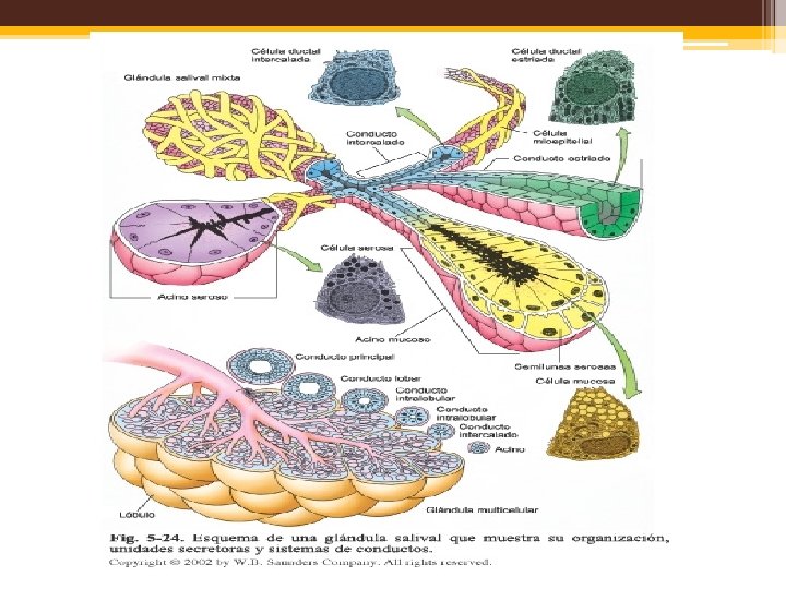 Tejido glandular. • Se originan a partir de células epiteliales que dejan la superficie en que se desarrollaron y penetran en el tejido conectivo subyacente y elaboran alrededor de ellas una lámina basal. • Las unidades secretorias, aunadas a sus conductos, son EL PARENQUIMA de la glándula. • EL ESTROMA de la glándula representa los elementos del tejido conectivo que invaden y apoyan el parénquima.