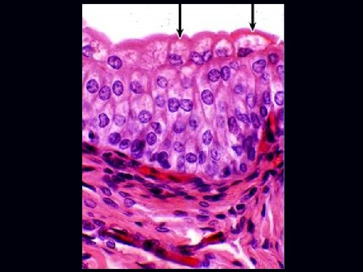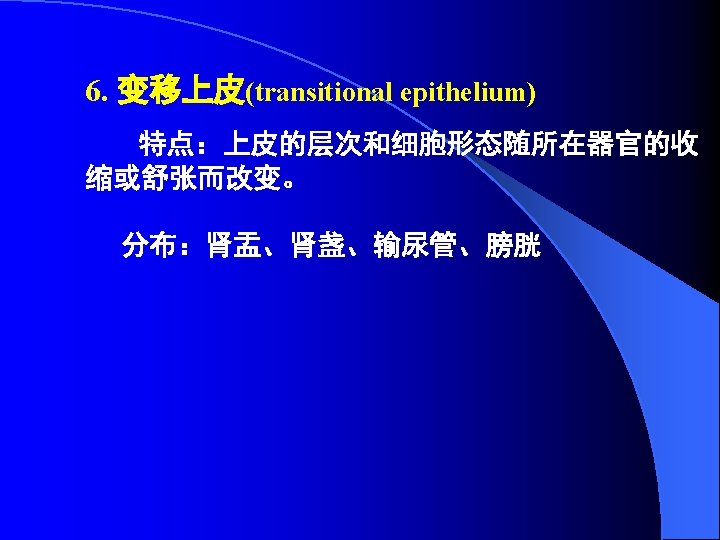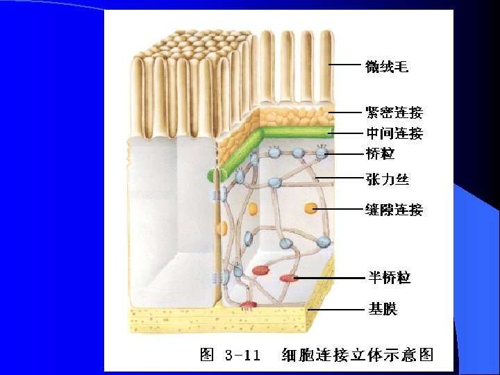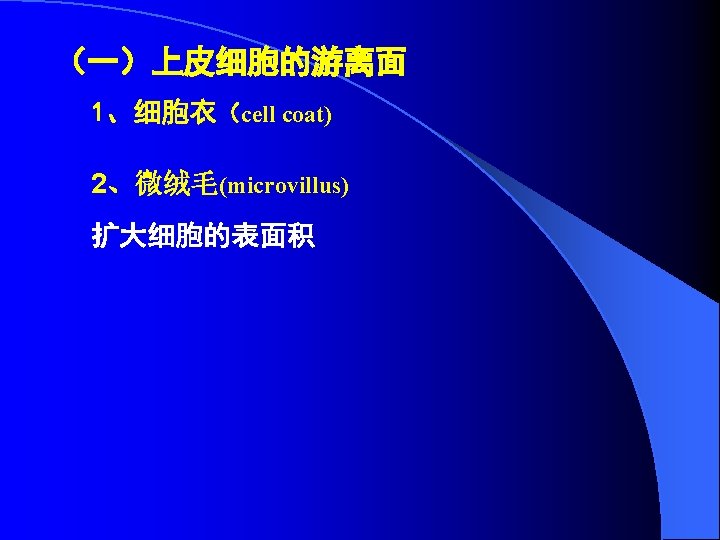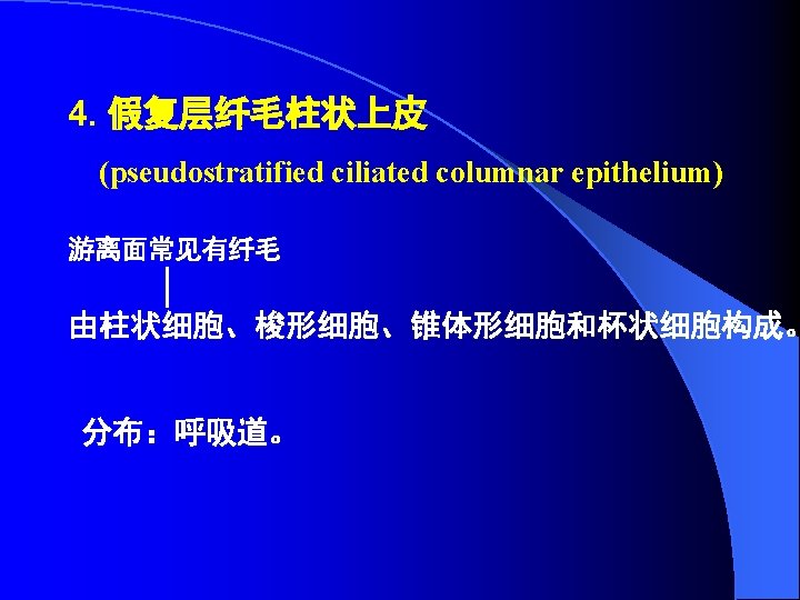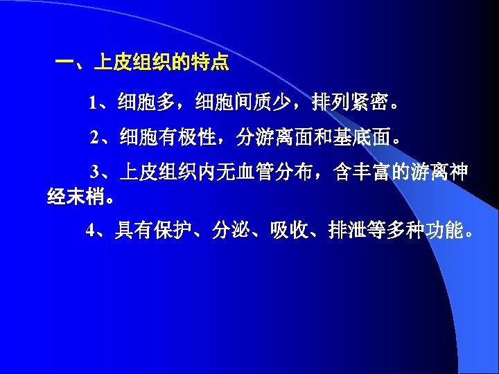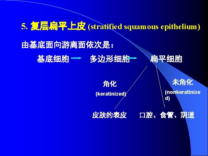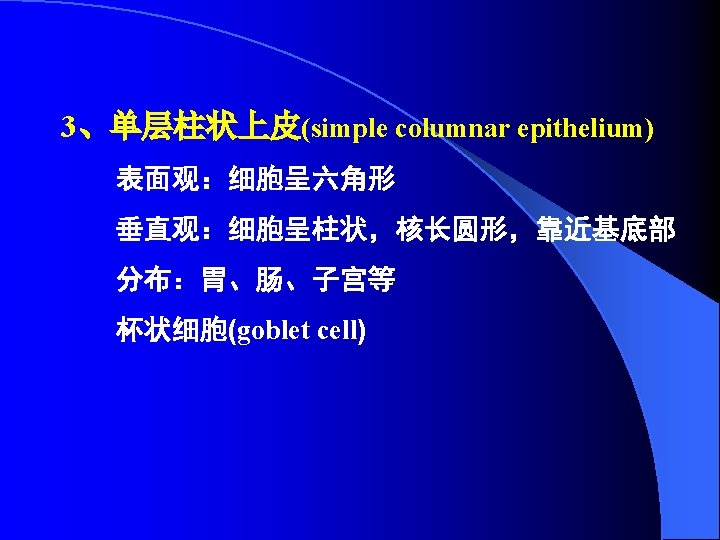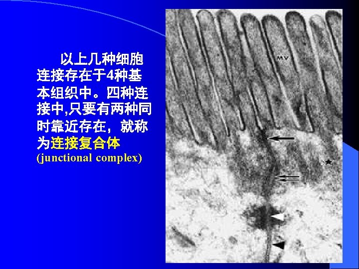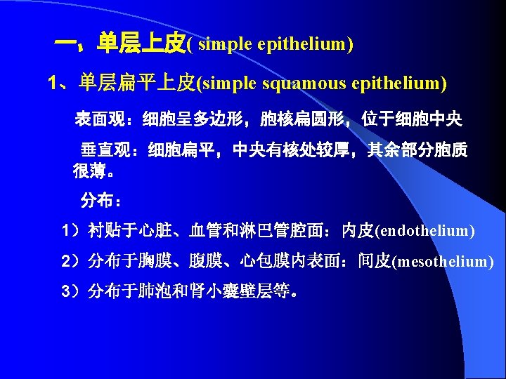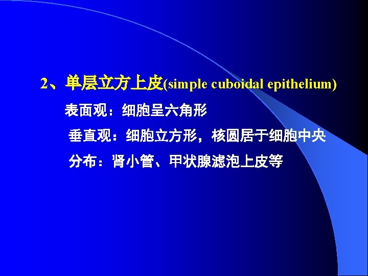 Epithelial Tissue covering epithelium glandular epithelium sensory epithelium Slides: 32 Download presentation 上 皮 组 织 Epithelial Tissue 被覆上皮(covering epithelium) 上皮组织的分类 腺上皮(glandular epithelium) 感觉上皮(sensory epithelium) 二、被覆上皮 依据上皮细胞的层数和细胞的形状分类 扁平上皮 Squamous Epi. 单层 立方上皮 Cuboidal Epi. simple 柱状上皮 Columnar Epi. 假复层纤毛柱状上皮 被覆上皮 Covering Epi. pseudostratified ciliated columnar Epi. 扁平上皮 Squamous Epi. 复层 stratified 变移上皮 Transitional Epi. 三、上皮组织的特殊结构(specialized structure) 细胞衣 cell coat 游离面 微绒毛 microvillus 纤毛 cilium 紧密连接 tight junction 上皮细胞 侧面 中间连接 intermediate junction 桥粒 desmosome 缝隙连接 gap junction 基膜 basement membrane 基底面 质膜内褶 plasma membrane infolding 半桥粒 hemidesmosome (二)上皮细胞的 侧面 1、紧密连接 (tight junction) 2、中间连接 (intermediate junction) 3、桥粒 (desmosome) 4、缝隙连接 (gap junction) (三)上皮细胞的基底面 1、基膜(basement membrane) 基板(basal lamina) 网板(reticular lamina) 2、质膜内褶(plasma membrane infolding) 3、半桥粒(hemidesmosome) 质膜内褶 Plasma membrane infolding