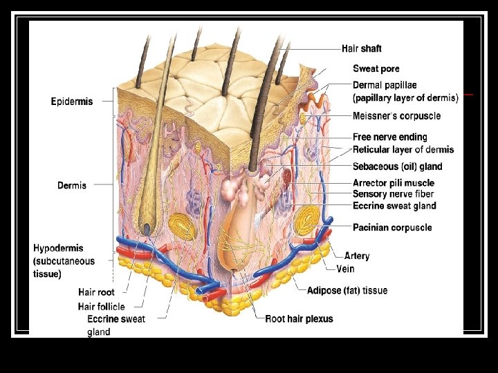 Skin coloring n Melanin n n Carotene n n Yellow, brown or black pigments Orange-yellow pigment from some vegetables Hemoglobin n n Red coloring from blood cells in dermis capillaries Oxygen content determines the extent of red coloring