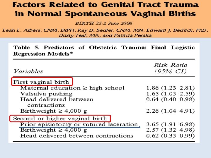 Perineal Travma için Risk Faktörleri Makrozomi Epidural anestezi Operatif doğum Doğum indüksiyonu Epizyotomi