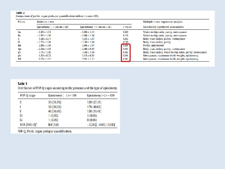 439 hasta, 110 hasta epizyotomisiz POP-Q’ ya göre prolapsus tesbit edilen hastaların % 38. 2 epizyotomisiz, % 32 epizyotomili idi. Epizyotomi ile POP-Q evrelemesi arasında anlamlı ilişki tesbit edilmedi (P: 0. 26). Epizyotomi belirli POP-Q noktaları Bp, pb, tvl’un prolapsusu ile negatif korele izlendi.