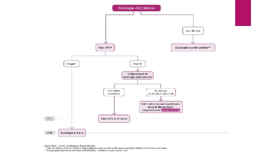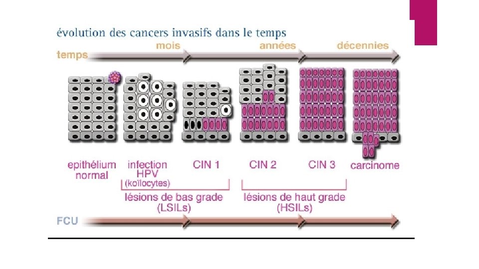 Classification NILM = normal LSIL = Lésion malpighienne intra-épithéliale de bas grade ASCUS = Cellules malpighiennes atypiques de signification indéterminée ASCH = Cellules malpighiennes atypiques ne permettant pas d'éliminer une lésion malpighienne intraépithéliale de haut grade HSIL = Lésion malpighienne intra-épithéliale de haut grade AGC = Cellules cylindriques atypiques