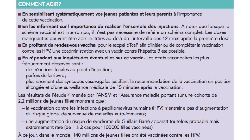 2 VACCINS GARDASIL (6, 11, 16, 18) Jusquà 14 ans : 2 injections à 0 -6 MOIS A partir de 14 ans : 3 injections à 0 -2 -6 MOIS Condylome 120 euros / inj CERVARIX (16, 18 avec adjuvant) Jusqu’à 14 ans : 2 injections à 0 -6 MOIS A partir de 14 ans : 3 injections à 0 -1 -6 MOIS 109 euros / inj
