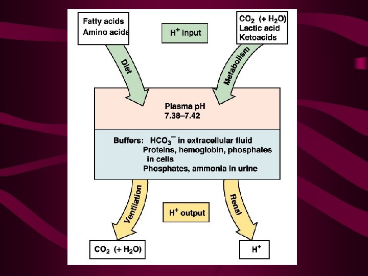 A homeostase do p. H depende de tampões, dos pulmões e dos rins • Como o organismo modula as mudanças de p. H? • Existem 3 mecanismos: – tampões: primeira linha de defesa; – ventilação: resposta rápida, controla até 75% das alterações de p. H; – rins: mais lentos, mas muito eficazes.