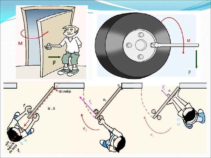 F é a força aplicada sobre o corpo (N); d é a distância até o eixo de rotação (m); M é o momento da força F (Nm). *Sinais: momento no sentido horário (-); momento no sentido anti-horário (+). *** Note que para uma mesma força aplicada sobre um corpo, quanto maior for a distância até o eixo de rotação, maior será o momento dessa força. Isso significa que o corpo tende a entrar em movimento de rotação mais facilmente!!! Observe mais algumas figuras: