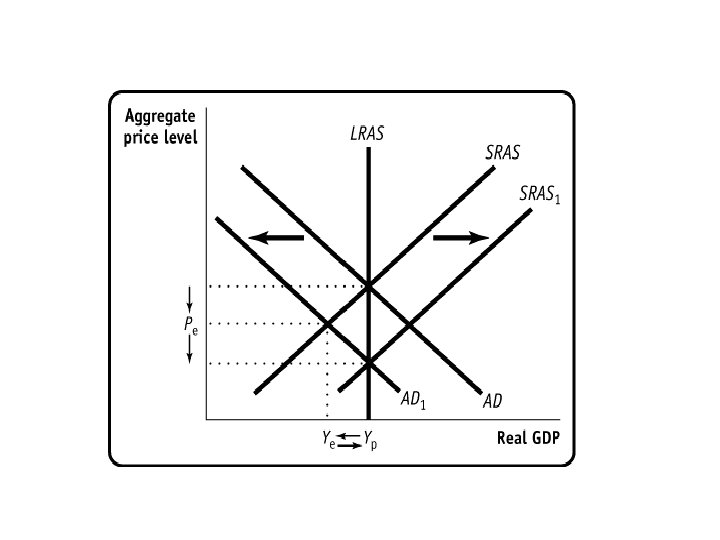 Long Run Equilibrium (cont. ) • What happens next? • The labor market is weakened by the poor economy and unemployment begins to rise as workers are laid off. • Eventually nominal wages begin to fall. • As nominal wages fall, SRAS begins to shift to the right. • The recessionary gap begins to shrink because real GDP is rising. • Once real GDP has returned to Yp, the economy is back in long-run equilibrium. • The price level has fallen even further.
