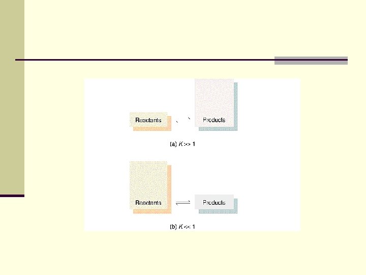 Size of Keq : The Equilibrium Position n If we say equilibrium lies far to the left or favors the reactants The reactant concentrations are much larger than the product concentrations at equilibrium n K<1 n n If we say equilibrium lies far to the right or favors the products The product concentrations are much larger than the reactant concentrations at equilibrium n K>1 n