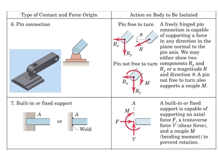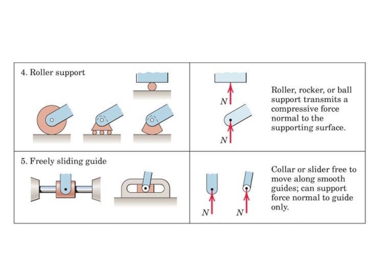 Common Support / Connection Element Types in Two Dimensional Analysis In rigid bodies subjected to two dimensional force systems, the forces exerted from supports and connection elements are shown in the free body diagram as follows: It should be kept in mind that reaction will occur along the direction in which the motion of the body is restricted.