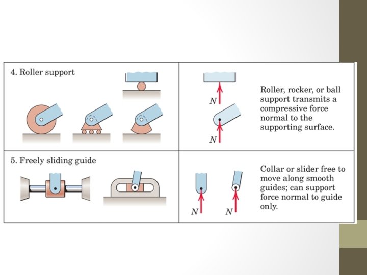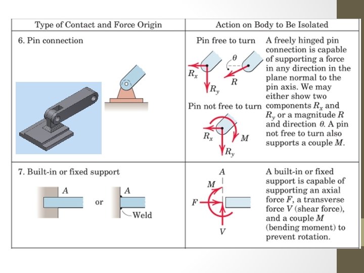 Common Support / Connection Element Types in Two Dimensional Analysis In rigid bodies subjected to two dimensional force systems, the forces exerted from supports and connection elements are shown in the free body diagram as follows: It should be kept in mind that reaction will occur along the direction in which the motion of the body is restricted.