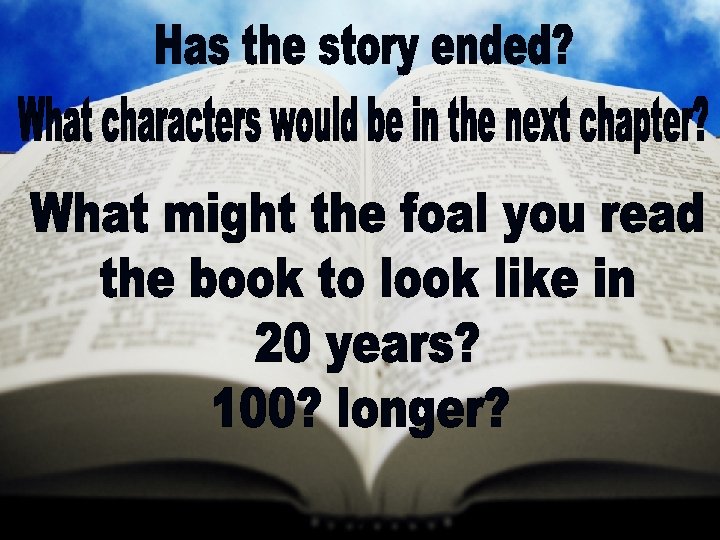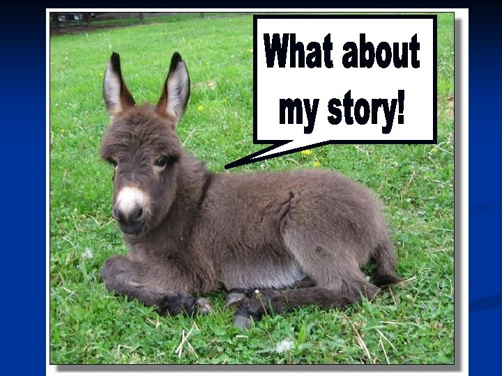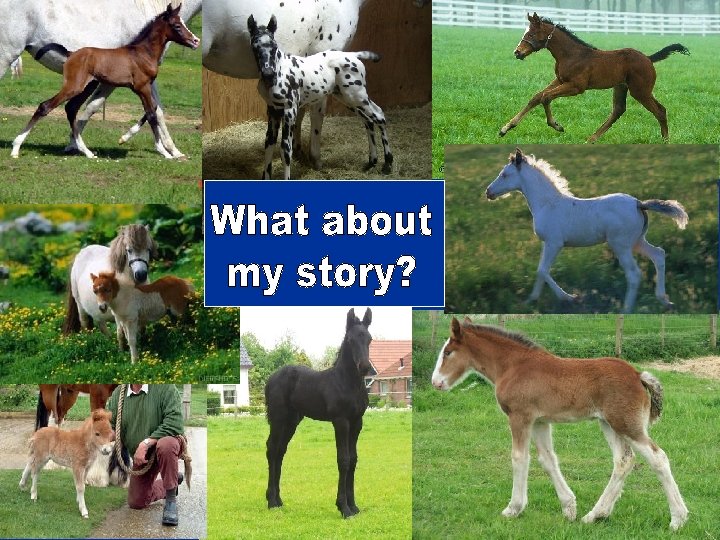 Story Requirements Must be in a book form with a title n At least one illustration or cartoon (drawn by you) n You may only use the images in this powerpoint for your story NO OTHER SOURCES n Must read like a bedtime story for a little foal n Try to explain major changes and reasons for them Grading I am grading based on the entire product. I will consider the above list and creativity. This will be a 40 point grade. ***Any story I choose to read to the class will receive 10 points extra credit. n