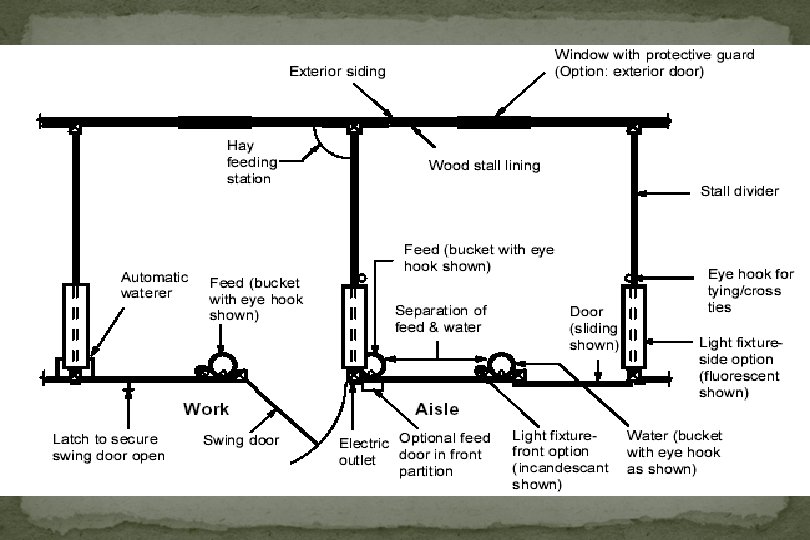 Stalls l Height l 8 -9’ l Solid – 4 -5’ l Slatted for ventilation l Ceilings l Min. 8’ l Lighting l One light/10’ aisle way l Each stall l Electrical outlets