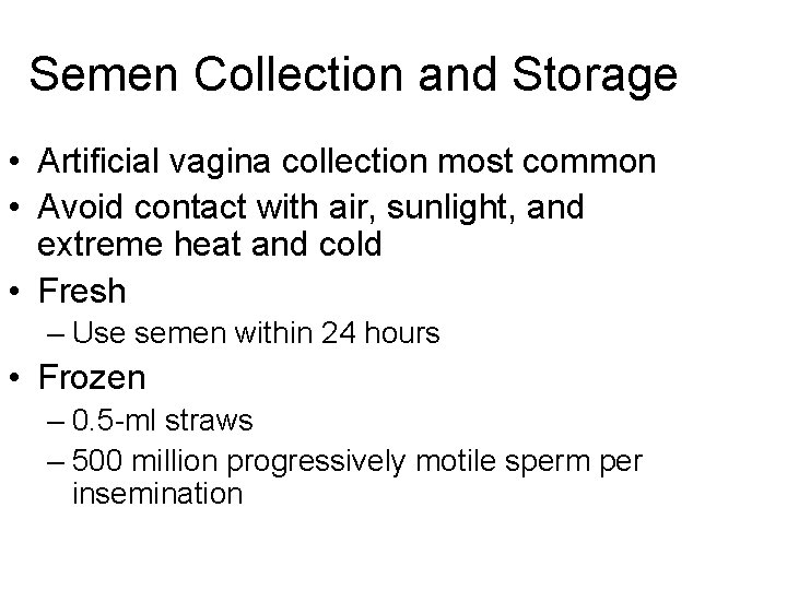 Semen Collection and Storage • Artificial vagina collection most common • Avoid contact with air, sunlight, and extreme heat and cold • Fresh – Use semen within 24 hours • Frozen – 0. 5 -ml straws – 500 million progressively motile sperm per insemination