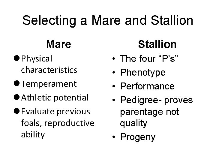 Selecting a Mare and Stallion Mare l Physical characteristics l Temperament l Athletic potential l Evaluate previous foals, reproductive ability Stallion • • The four “P’s” Phenotype Performance Pedigree- proves parentage not quality • Progeny