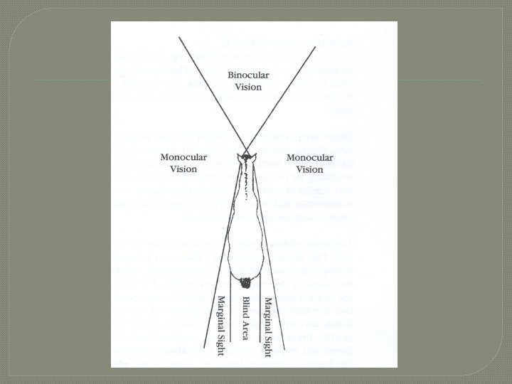 Facts About Vision � Blind spots • Where? �Directly behind its hindquarters � Can’t see directly below its head �Must lower its head to • See far away