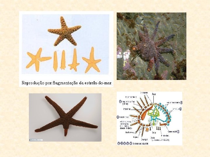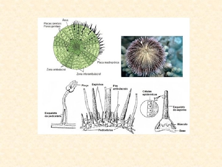 Sistema nervoso Ø Não possuem SNC – (Difuso) Ø Primitivo. Composto por anel nervoso que circunda a boca (peribucal), com nervos radiais. Ø Receptores táteis e químicos espalhados pelo corpo. Reprodução Ø Sexuada. - Espécies dióicas. Gametas eliminados na água. Fecundação externa e desenvolvimento indireto (larvas plúteo em ouriços, e bipinária e braquiolária em estrelas). Ø Assexuada - regeneração